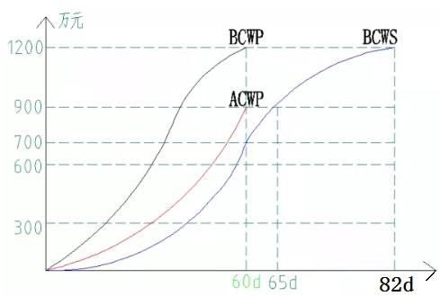 项目部采取措施,调整进度计划,采用赢得值法监控项目的进度和费用,绘制了项目执行60d后的赢得分析法曲线图。