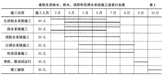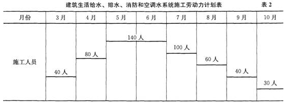 某分包单位承接该任务后,编制了施工方案、施工进度计划(见表1中细实线)、劳动力计划(见表2)和材料采购计划等;施工进度计划在审批时被否定,原因是生活给水与排水系统的先后顺序违反了施工原则,分包单位调整了该顺序(见表1中粗实线)。