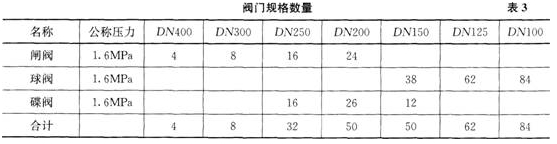 施工中,采购的第一批阀门(见表3)按计划到达施工现场,施工人员对阀门开箱检查,按规范要求进行了强度和严密性试验,主干管上起切断作用的DN400、DN300阀门和其他规格的阀门抽查均无渗漏,验收合格。
