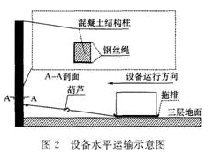 施工单位项目部进场后,编制了施工组织设计和各专项方案。因设备布置在主楼三层设备间,采用了设备先垂直提升到三楼,再水平运输至设备间的运输方案。设备水平运输时,使用混凝土结构柱做牵引受力点,并绘制了设备水平运输示意图(如图2所示),报监理及建设单位后被否定。