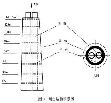 A公司承担某炼化项目的硫磺回收装置施工总承包任务,其中烟气脱硫系统包含的烟囱由外筒和内筒组成,外筒为钢筋混凝土筒壁,高145m;内筒为等直径自立式双管钢筒,高150m,内筒与外筒之间有8层钢结构平台,每层间由钢梯连接,钢结构平台安装标高,如图3所示。