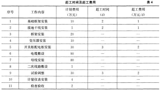 在签订合同时,业主还与安装公司约定,提前一天完工奖励5万,延后一天罚款5万,赶工时间及赶工费用见表4。变配电室的设备进场后,变压器因保管不当受潮,干燥处理增加费用3万,最终安装公司在约定送电前,提前6d完工,验收合格。