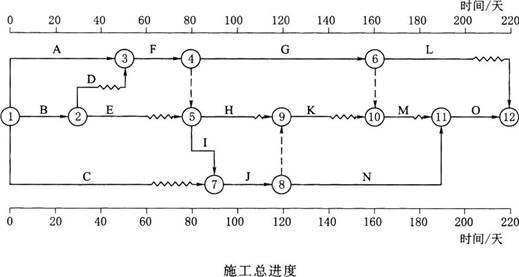 6、某泵站工程,发包人与承包人按照《水利水电工程标准施工招标文件(2009年版)》签订了施工合同。经总监理工程师批准的施工总进度见下页图(时间单位:天),合同工期为220天,各项工作均按最早开始时间安排且匀速施工。