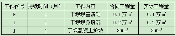 工程开工后在施工范围内新增一丁坝。丁坝施工工作面独立,其坝基清理、坝身填筑、混凝土护坡等三项工作依次施工,在第5个月初开始施工,堤顶道路修复开工前结束:丁坝坝基清理、坝身填筑工作的内容和施工方法与堤防施工相同;双方约定,混凝土护坡单价为300元/m3,丁坝工程量不参与工程量变更。各项工作的工程量、持续时间见下表。