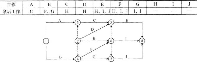 85、某分部工程中各项工作间逻辑关系见下表,相应的双代号网络计划见下图,图中的错误有( )。