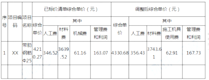事件3:施工招标时,工程量清单中Φ25规格的带肋钢筋材料单价为暂估价,暂估价价格3500/t,数量260t,施工单位按照合同约定组织了招标,以3600元/t的价格购得该批材料并得到建设单位确认,施工完成该材料130t进行结算时,施工单位提出:材料实际釆购价比暂估材料价格增加了2.86%,所以该项目的结算综合单价应调增2.86%,调整内容见表3.1。已知该规格带肋钢筋主材损耗率为2%。