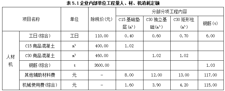 5、某城市188米大跨度预应力拱形钢桁架结构体育场馆,下部钢筋混凝土基础平面布置图及基础详图设计如图5.1“基础平面布置图”、图5.2“基础详图”所示。中标该项目的施工企业,考虑为大体积混凝土施工,为加强成本核算和清晰掌握该分部分项工程实际成本,拟采用实物量法计算该分部分项工程费用目标管理控制价。该施工企业内部相关单位工程量人、材、机消耗定额及实际掌握项目所在地除税价格见下表5.1“企业内部单位工程量人、材、机消耗定额”。