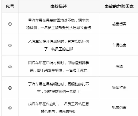 2、某建筑施工项目使用了汽车吊,为了区分识别吊装作业的危险因素,该项目安全管理人员对汽车的事故数据进行了记录。事故描述和危险因素分类,根据《企业职工伤亡事故分类》(GB6441),下列事故危险因素分类错误的是()。