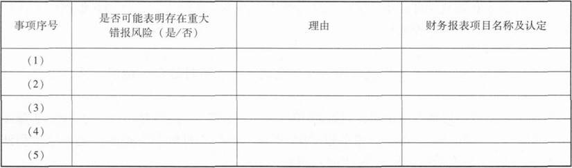 (1)针对资料一第(1)至(5)项,结合资料二,假定不考虑其他条件,逐项指出资料一所列事项是否可能表明存在重大错报风险。如果认为可能表明存在重大错报风险,简要说明理由,并说明该风险主要与哪些财务报表项目的哪些认定相关(不考虑税务影响)。将答案直接填入答题区的相应表格内。
