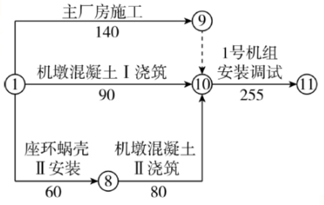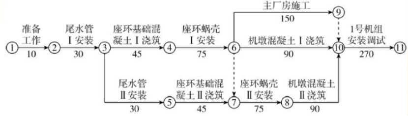 事件二:座环蜗壳Ⅰ安装和座环基础混凝土Ⅰ浇筑完成后,因不可抗力事件导致后续工作均推迟一个月开始,发包人要求承包人加大资源投入,对后续施工进度计划进行优化调整,确保首台机组安装按原计划工期完成,承包人编制并报监理人批准的首台发电机组安装后续施工进度计划见图2(单位:天)。并约定,相应补偿措施费用90万元,其中包含了确保首台机组安装按原计划工期完成所需的赶工费用及工期奖励。