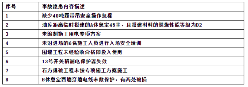 事件三:项目法人主持召开安全例会,要求甲公司按《水利水电工程施工安全管理导则》(SL721-2015)及时填报事故信息等各类水利生产安全信息。安全例会通报中提到的甲公司施工现场存在的部分事故隐患见下表。