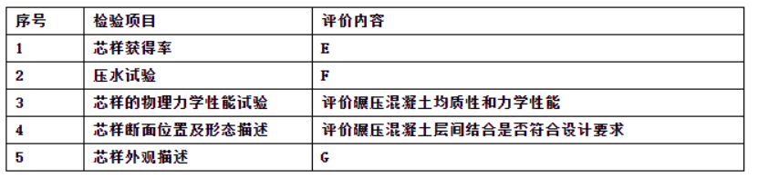 事件三:碾压混凝土坝施工中,采取了仓面保持湿润等养护措施。2016年9月,现场对已施工完成的碾压混凝土坝体钻孔取芯,钻孔取芯检验项目及评价内容如下表所示。