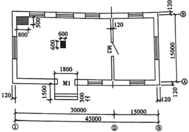 32、某建筑平面图如图所示,外墙厚度为240mm,内墙厚度为120mm,轴线居中布置。独立柱截面尺寸为600mm×600mm。M1洞口尺寸1200mm×2400mm,M2洞口尺寸1000mm×2100mm,①轴交B轴处为800mm×500mm砖砌烟道。