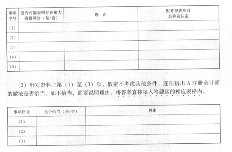 (1)针对资料一第(1)至(5)项,结合资料二,假定不考虑其他条件,逐项指出资料一所列事项是否可能表明存在重大错报风险。如果认为可能表明存在重大错报风险,简要说明理由,并说明该风险主要与哪些财务报表项目的哪些认定相关(不考虑税务影响)。将答案直接填入答题区的相应表格内。