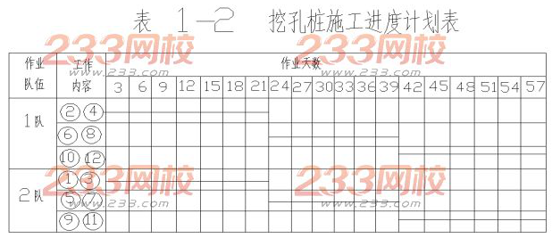 事件五:项目部按两个施工队同时进行人工挖孔桩施工,计划显示挖孔桩施工需57天完工,施工进度计划见表1-2,为加快工程进度,项目经理决定将9、10、11、12号桩安排第三个施工队进场施工,三队同时作业。