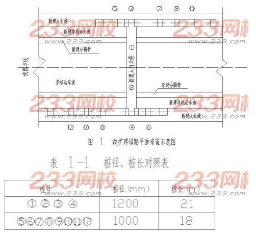 某施工单位承建城镇道路改扩建工程,全长2km,工程项目主要包括:(1)原机动车道的旧水泥混凝土路面加铺沥青混凝土面层:(2)原机动车道两侧加宽、新建非机动车道和人行道;(3)新建人行天桥一座,人行天桥桩基共设计12根,为人工挖孔灌注桩,改扩建道路平面布置如图1所示,灌注桩的桩径,桩长见表1—1