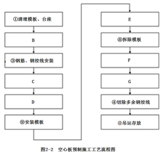 2.写出图2-2中空心板施工工艺流程框图中施工工序B、C、D、E、F、G的名称。(选用背景资料给出的施工工序①~⑫的代号或名称作答)