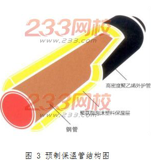某公司承接一项供热管线工程,全长1800m,直径DN400mm,采用高密度聚乙烯外护管聚氨酯泡沫塑料预制保温管,其结构如图3所示;其中340m管段依次下穿城市主干路、机械加工厂,穿越段地层主要为粉土和粉质黏土,有地下水,设计采用浅埋暗挖法施工隧道(套管)内敷设,其余管段采用开槽法直埋敷设。
