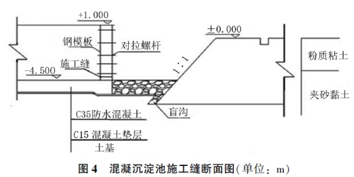项目部编制的混凝沉淀池专项施工方案内容包括:明挖基坑采用无支护的放坡开挖形式;池底板设置后浇带分次施工;池壁竖向分两次施工,施工缝设置钢板止水带,模板采用特制钢模板,防水对拉螺栓固定。沉淀池施工横断面布置如图4所示。依据进度计划安排,施工进入雨期。