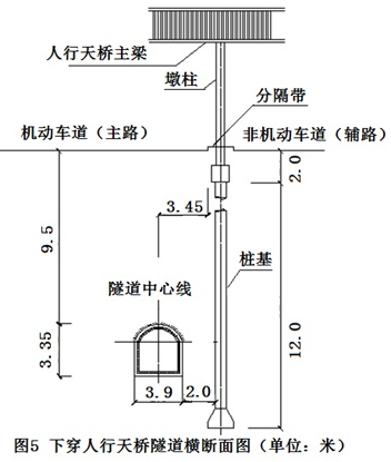 某公司承建城区防洪排涝应急管道工程,受环境条件限制,其中一段管道位于城市主干路机动车道下,垂直穿越现状人行天桥,采用浅埋暗挖隧道形式;隧道开挖断面3.9m×3.35m,横断面布置如图5所示。施工过程中,在沿线3座检查井位置施作工作竖井,井室平面尺寸长6.0m,宽5.0m。井室、隧道均为复合式衬砌结构,初期支护为钢格栅+钢筋网+喷射混凝土,二衬为模筑混凝土结构,衬层间设塑料板防水层。隧道穿越土层主要为砂层、粉质黏土层,无地下水。设计要求施工中对机动车道和人行天桥进行重点监测,并提出了变形控制值。