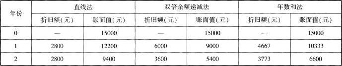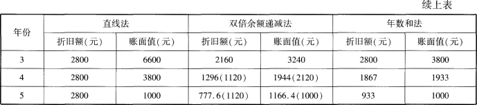 第3年折旧额及账面净值:(15000-1000)(3/15)=2800(元);6600-2800=3800(元)