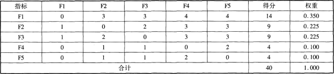 根据评标专家对五项指标的相对重要程度排序F1>F2=F3>F4=F5,以及0-4评分原则,列出评分表。(绝对重要一方记4分,对应一方记0分;较重要一方记3分,对应一方记1分:同等重要双方均记2分)