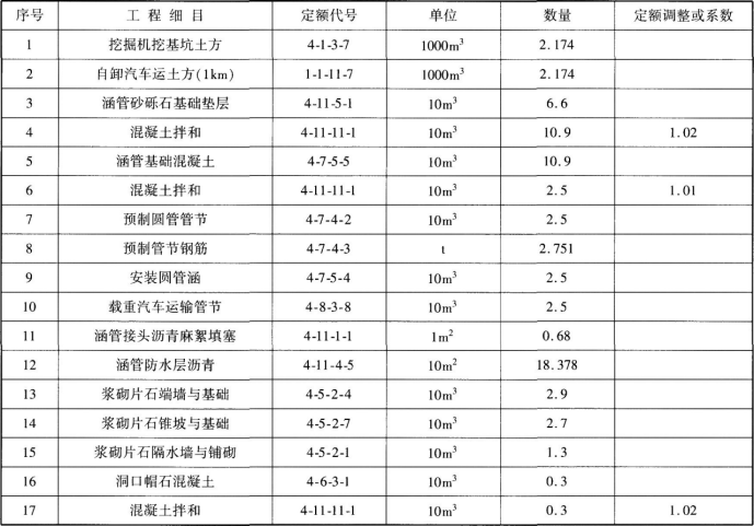 (1)根据题目所给出工程量分析,钢筋混凝土圆管涵施工过程还应包括涵管接头沥青麻絮填塞及涵管涂防水沥青,应根据题目补充计算。