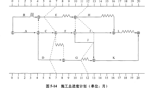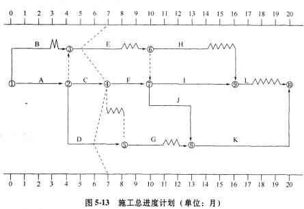 7、某工业厂房工程,合同工期为20个月。在工程开工之前,总承包单位向总监理工程师提交了施工总进度计划,各工作均匀速进行(如图5.13所示)。该计划得到总监理工程师的批准。
