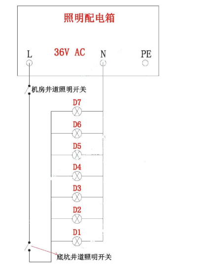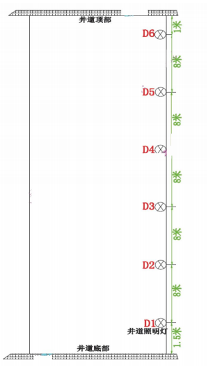 对施工方案进行审核时发现,井道的照明布置图(如下图所示)不符合安全要求、井道内的照度也不能达标,要求项目部对施工方案进行优化。