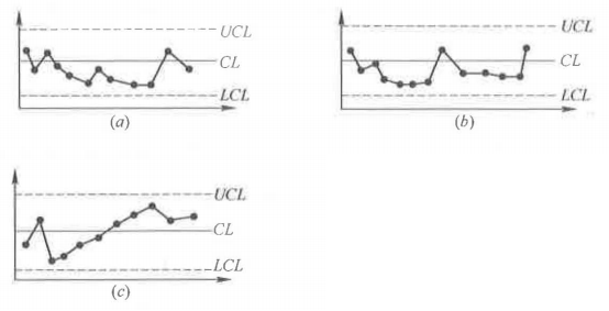 (b)工序异常,属于“多次同侧”。(是指点子在中心线一侧多次出现的现象,或称偏离。下列情况说明生产过程已出现异常,在连续11点中有10点在同侧。在连续14点中有12点在同侧。在连续17点中有14点在同侧。在连续20点中有16点在同侧。)