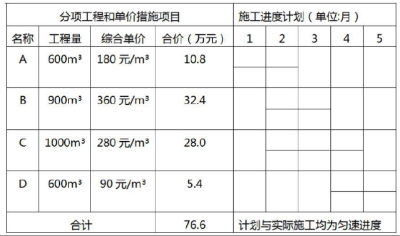 6、某工程项目发包人与承包人签订了施工合同,工期5个月。分项工程和单价措施项目的造价数据与经批准的施工进度计划如表所示;总价措施项目费用9万元(其中含安全文明施工费3万元);暂列金额12万元。管理费和利润为人材机费用之和的15%。规费和税金为人材机费用与管理费、利润之和的10%。