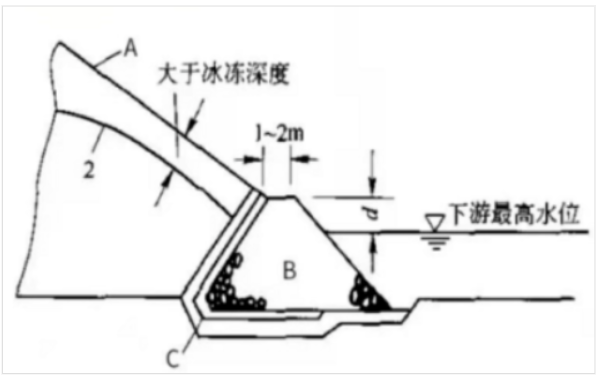 1.A:下游坝坡 B:棱体排水 C:反滤层