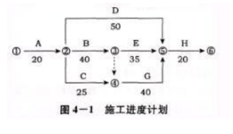 3、某建设单位和施工单位按照《建设工程施工合同(示范文本)》签订了施工合同,合同中约定:建筑材料由建设单位提供;由于非施工单位原因造成的停工,机械补偿费为200元/台班,人工补偿费为50元/日工;总工期为120天;竣工时间提前奖励为3000元/天,误期损失赔偿费为5000元/天。经项目监理机构批准的施工进度计划如图4—1所示(单位:天)。