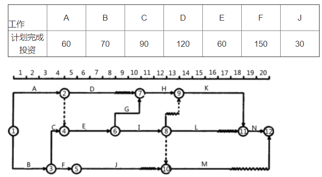 5、某工程建设单位与施工单位按照《建设工程施工合同(示范文本)》签订了施工合同,采用可调价施工合同形式。工期20个月,项目监理机构批准的施工总进度计划如下图所示,各项工作在其持续时间内均按匀速进展,每月完成投资如下表所示。单位:万元