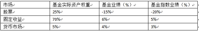 93、某QDII混合型基金,其业绩比较基准为30%*恒生指数收益率+65%*标普中国A股全债指数收益率+5%*货币市场收益率。各类资产实际权重收益率及其和指数业绩对比: