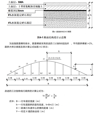 南方平原地区某一快速通道公路位于滨海区域,气候多雨,公路起讫桩号为K0+000~K30+000,线形平顺,双向六车道,无中央分隔带。行车道总宽度为B,每个车道宽度为3.75m。该公路为旧路改建,设计标高为公路中线位置。该工程采用柔性路面面层,基层采用半刚性基层,路面结构设计示意图如图4-1所示。为加强路面横向排水,路面横坡采用改进的三次抛物线型路拱,平均路拱横坡i=2%,路拱大样示意图及其计算公式如图4-2所示。