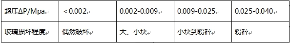 ;d为观测点到爆心的距离,m;W为药量.kg,冲击波超压导致玻璃破坏的准则见下表所示,若给定WTNT为8.0kg,d为10.0m处的玻璃门窗在炸药爆炸后,玻璃损坏程度为()。