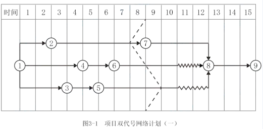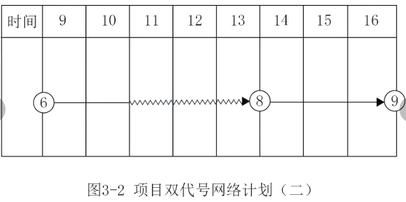 项目经理部在工程施工到第8月底时,对施工进度进行了检查,工程进展状态如图3-1中前锋线所示。工程部门根据检查分析情况,调整措施后重新绘制了从第9月开始到工程结束的双代号网络计划,部分内容如图3-2。