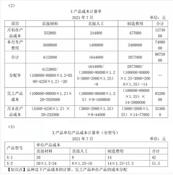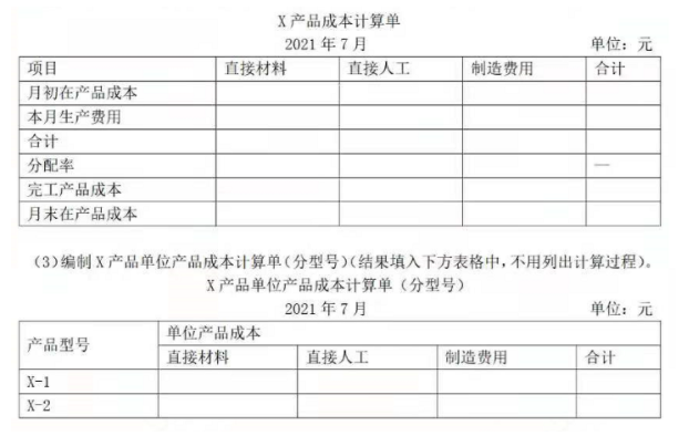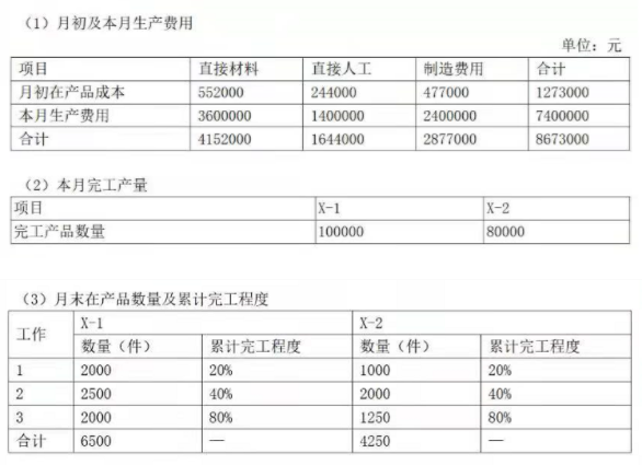 (1)计算X-1、X-2月末在产品直接材料、直接人工、制造费用的约当产量。(2)编制X产品成本计算单。(结果填入下方表格中,不用列出计算过程)