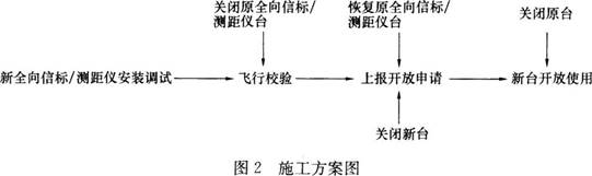 某支线机场于2000年建成通航,导航设施建设有仪表着陆/测距仪台和全向信标/测距仪台各一套,现对其进行更新。其中,仪表着陆/测距仪台为原址更新,机房利旧,并对接地系统进行改造,分别在航向台和下滑台机房四周增加地网400m;在原全向信标/测距仪台附近350m处新建一个全向信标/测距仪台,使用原台站的频率和呼号,台站土建工程已竣工。预计仪表着陆/测距仪比全向信标/测距仪晚到货一周。建设单位要求施工单位以尽早竣工为原则编制施工方案,施工期间至少要保证一套导航设施供机场运行使用,施工单位按要求编制工程施工方案,其中全向信标/测距仪台施工方案如图2所示: