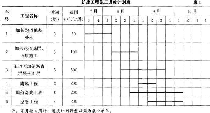 华北平原某4E级机场拟将跑道延长600m,并对原道面加铺沥青混凝土面层(盖被子)。B单位承揽了跑道加长工程,C单位承揽了旧道面加铺沥青混凝土工程,D单位承揽了附属工程,E、F单位分别承揽了目视助航灯光工程和空管工程。机场扩建指挥部在开工前编制了工程进度计划(见表1),并作出如下规定:(1)加长跑道基层、面层施工须在地基处理完成后进行;(2)旧道面加铺沥青混凝土面层和助航灯光工程最早只能在加长跑道基层、面层开工1周后进行;(3)附属工程必须在9月第2周周末结束;空管工程必须在10月第1周周末结束。