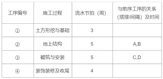 2.写出流水节拍参数表中:A、C对应的工序关系,B、D对应的时间。