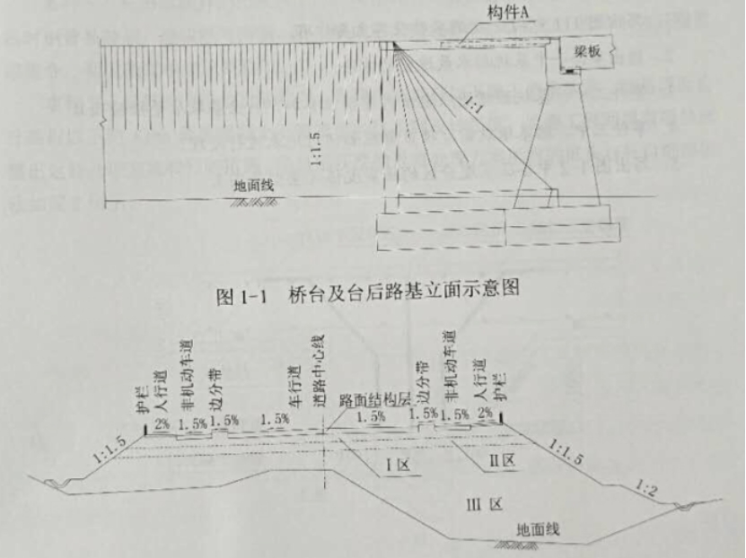 某公司承建一项路桥结合城镇主干路工程。桥台设计为重力式U型结构,基础采用扩大基础,持力层位于砂质黏土层,地层中有少量潜水;台后路基平均填土高度大于5m。场地地质自上而下分别为腐殖土层、粉质黏土层、砂质黏土层、砂卵石层等。桥台及台后路基立面如图1-1所示,路基典型横断面及路基压实度分区如图1-2所示。
