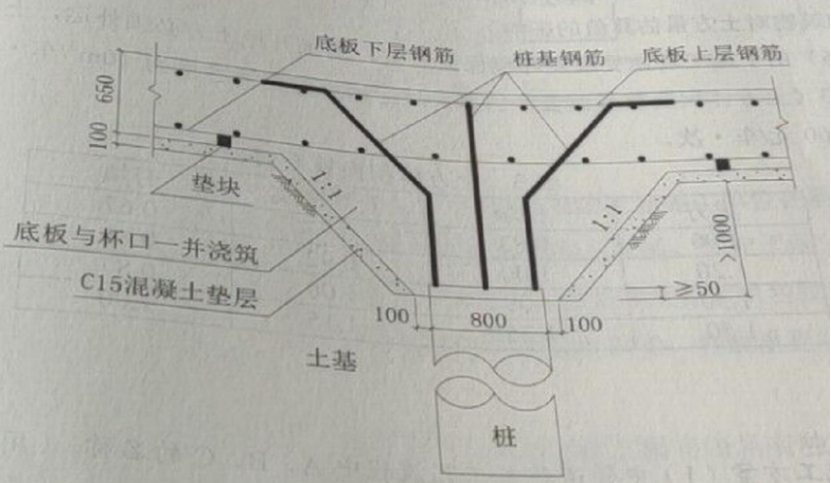 事件二:桩基首个验收批验收时,发现个别桩有如下施工质量缺陷:桩基顶面设计高程以下约1.0m范围混凝土不够密实,达不到设计强度。监理工程师要求项目然提出返修处理方案和预防措施。项目部获准的返修处理方案所附的桩头与杯口细部做法如图2所示。