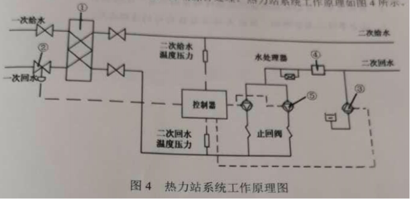 A公司中标承建一项热力站安装工程,该热力站位于某公共建筑物的地下一层。一次给回水设计温度为125℃/65℃,二次给回水设计温度为80℃/60℃,设计压力为1.6MPa;热力站主要设备包括板式换热器、过滤器、循环水泵、补水泵、水处理器、控制器、温控阀等;采取整体隔声降噪综合处理,热力站系统工作原理如图4所示。